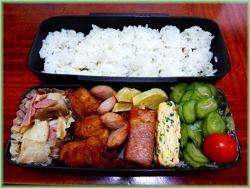 10月27日の、おやじが作る弁当 メニュー 鶏の唐揚げ・ポテトのベーコン巻き・ウインナー・ネギ入り卵焼き・フライドポテト エリンギとベーコンの炒め物・キュウリのジャコ入り酢の物・ミニトマト