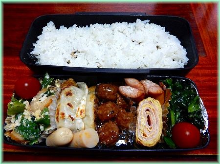 2023-06-14 6月14日のおやじ弁当 6月14日の、おやじが作る弁当 メニュー ギョーザ・ミートボール・ベーコン入り卵焼き・ちくわとネギの卵とじ ウインナー・ほうれん草の胡麻和え・ミニトマト・チリカマ